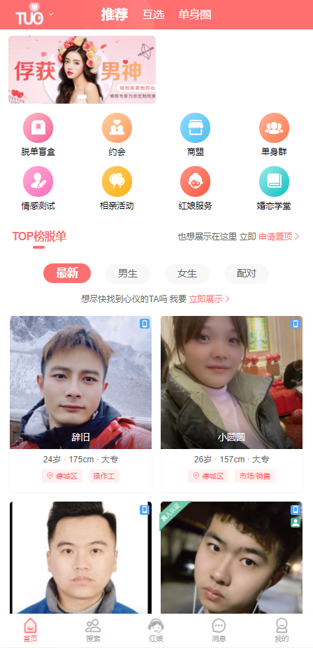 婚戀交友APP主要功能:【異性推薦】精zhun條件搜索,智能雙向匹配,輕松約到稱心如意的對象【精zhun匹配】--根據您的資料,推薦匹配異性【會員豐富】--上億單身男女,在線尋找有緣人【紅娘服務】--您身邊的貼身婚戀專家,相親就靠她【安全可靠】--嚴格身份核查,真人照片,真實資料【免費通話】通過“密號”與心儀異性通話,...